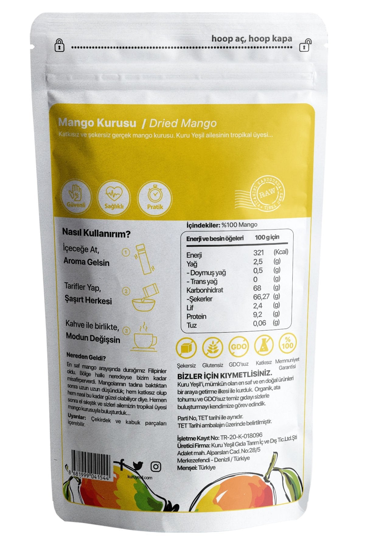 Experience the delicious and nutritious taste of Kuru Yeşil Natural Dried Mango. Each 3 pack contains 150 g of all-natural, dried mango, perfect for snacking or adding to your favorite dishes. Indulge guilt-free with our high-quality and sustainably sourced product.