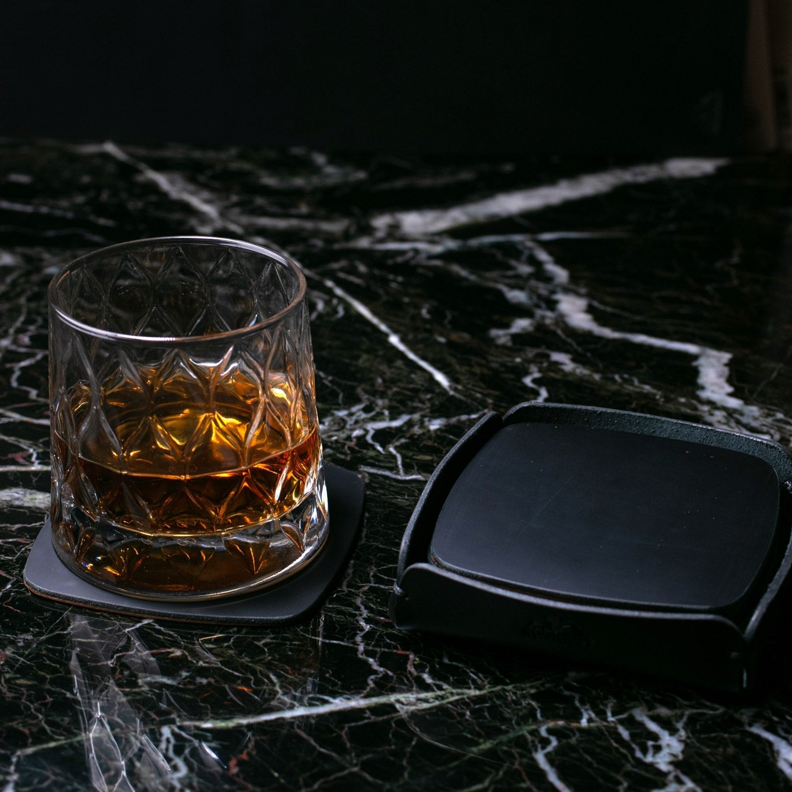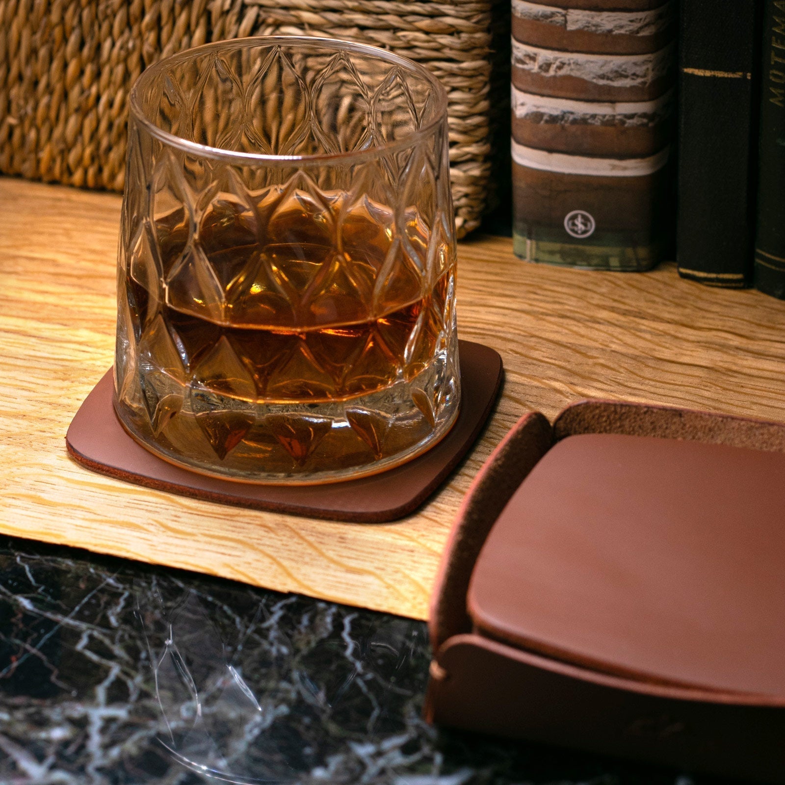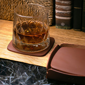 Enhance your drinking experience with the Leather Coaster Set of 5, crafted meticulously for both functionality and style. Each coaster, measuring 10 cm x 10 cm, is made from high-quality full-grain leather, ensuring durability and a luxurious feel.