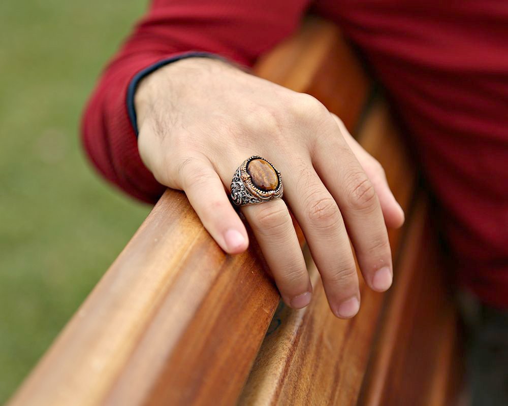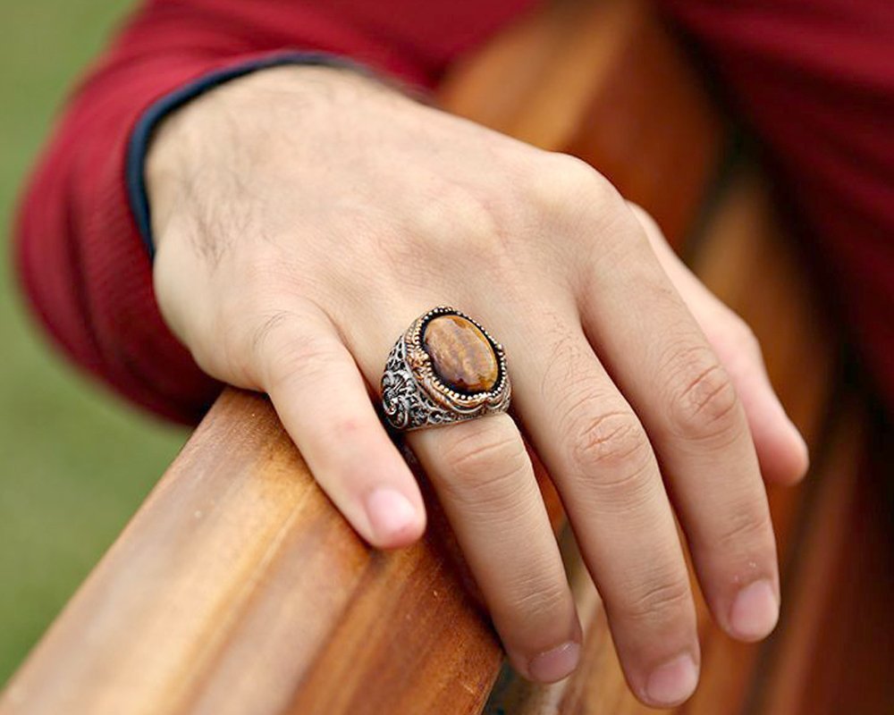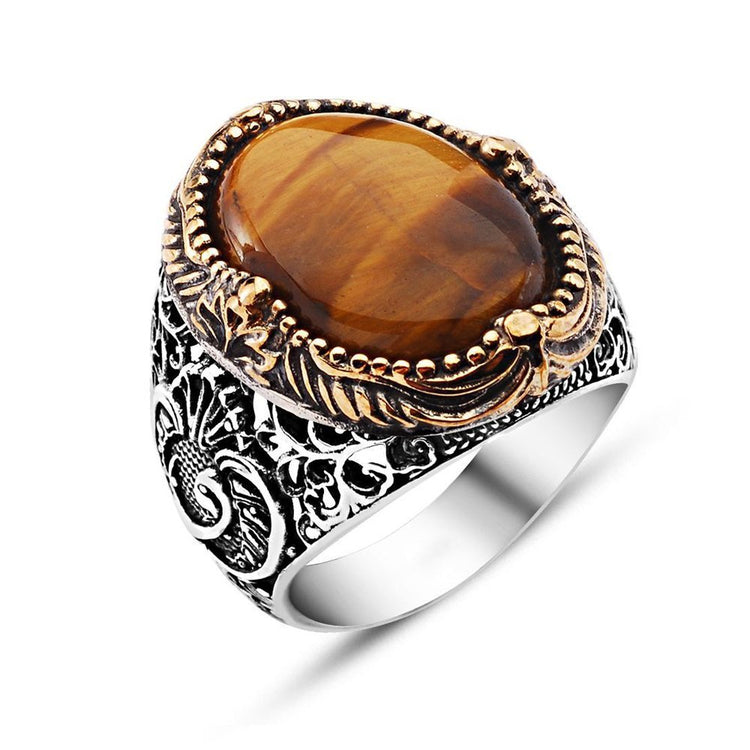 "و"Embroidered Tiger Eye Stone 925 Sterling Silver Men's Ring