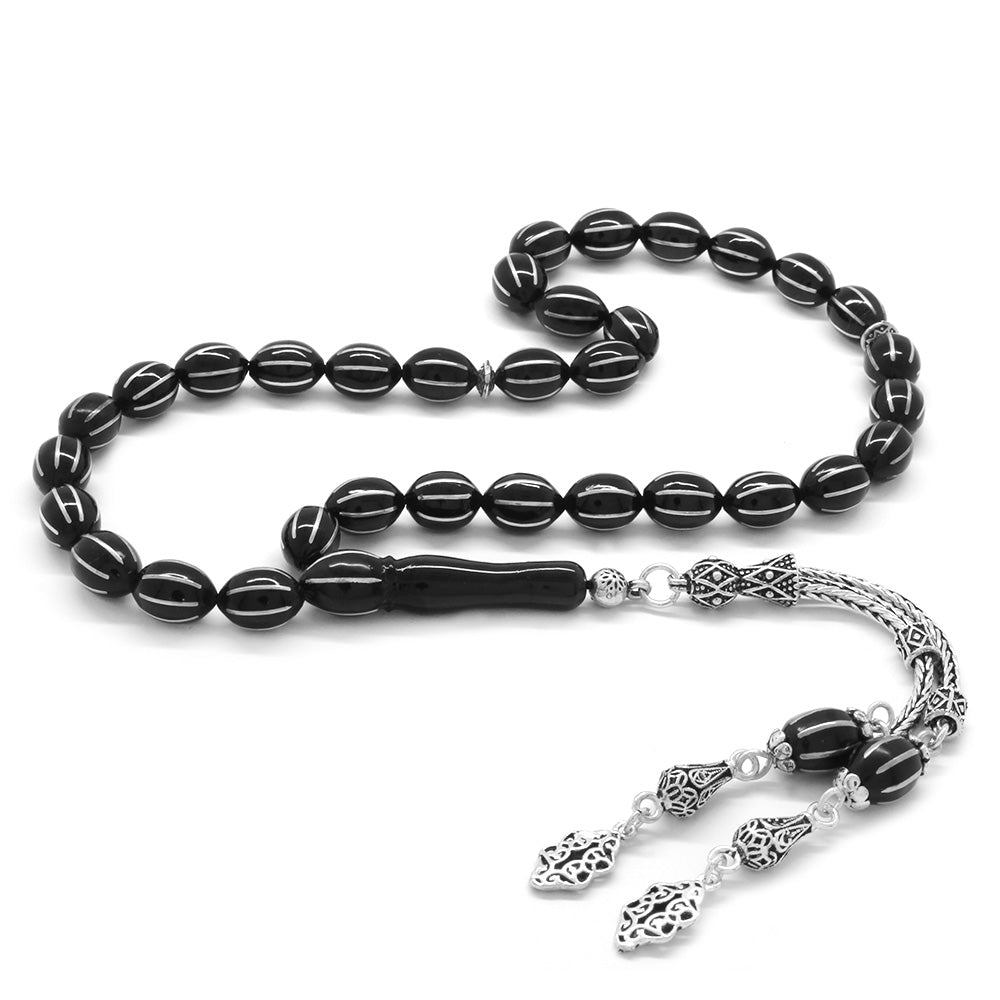 925 Sterling Silver Double Tasseled 6 - Piece Erzurum Oltu Stone Prayer Beads - EFENDINA PAZAR - Tesbihane - 101002832