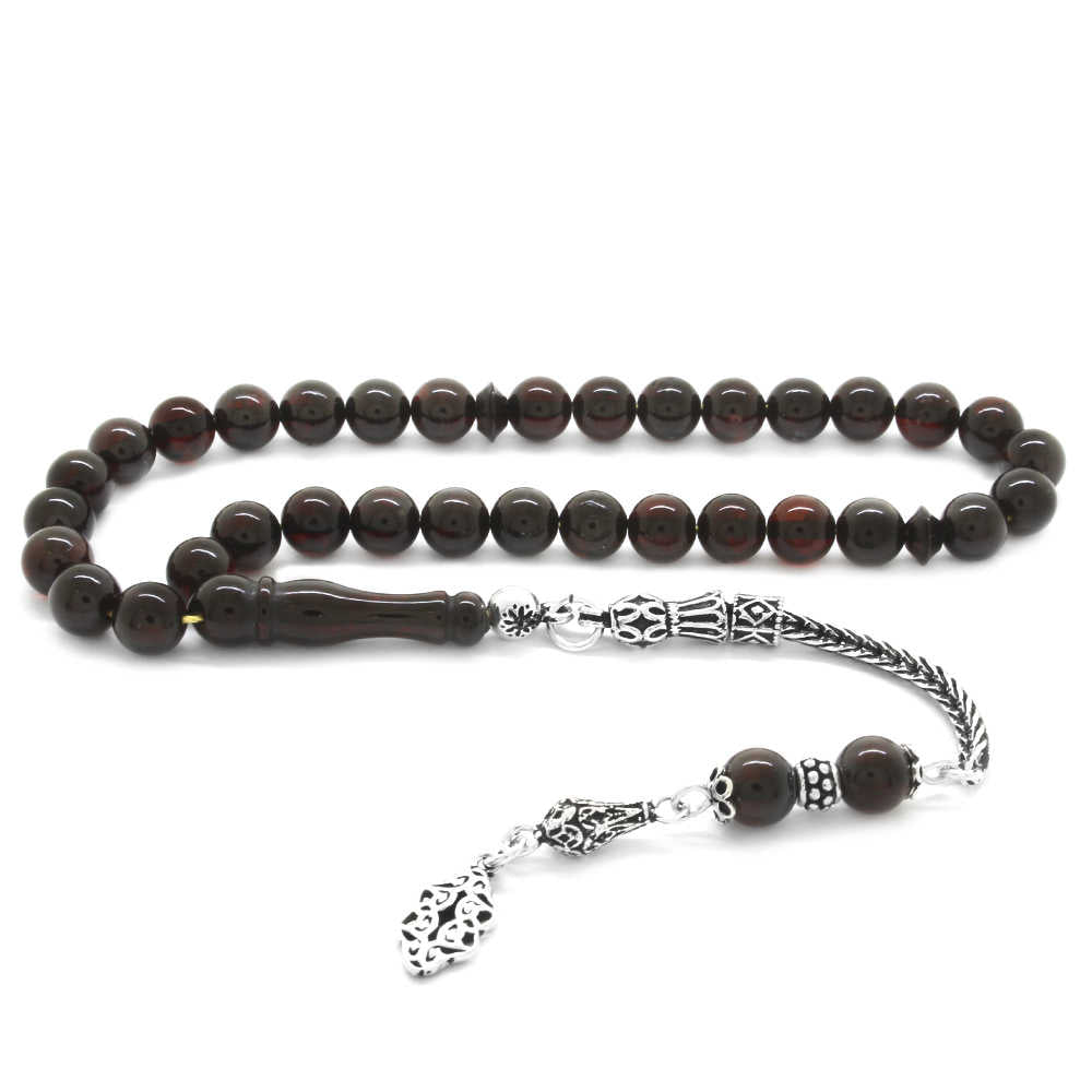 925 Sterling Silver Fire Red Drop Amber Rosary with Tassel - EFENDINA PAZAR - Tesbihane - 101001697
