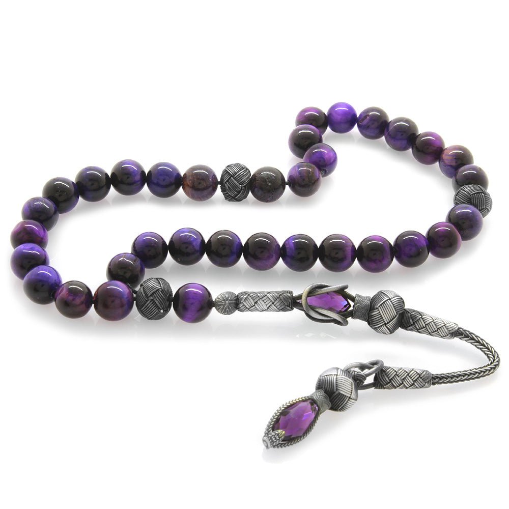 1000 Sterling Silver Sphere Cut Purple Tiger's Eye Natural Stone Prayer Beads with Kazaz Tassels - EFENDINA PAZAR - Tesbihane - 101001943