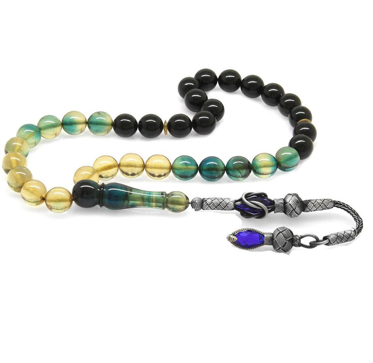 1000 Sterling Silver Kazaz Tasseled Sphere Cut Filtered Blue - White Fire Amber Rosary - EFENDINA PAZAR - Tesbihane - 101002043